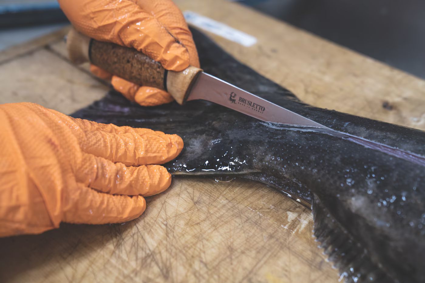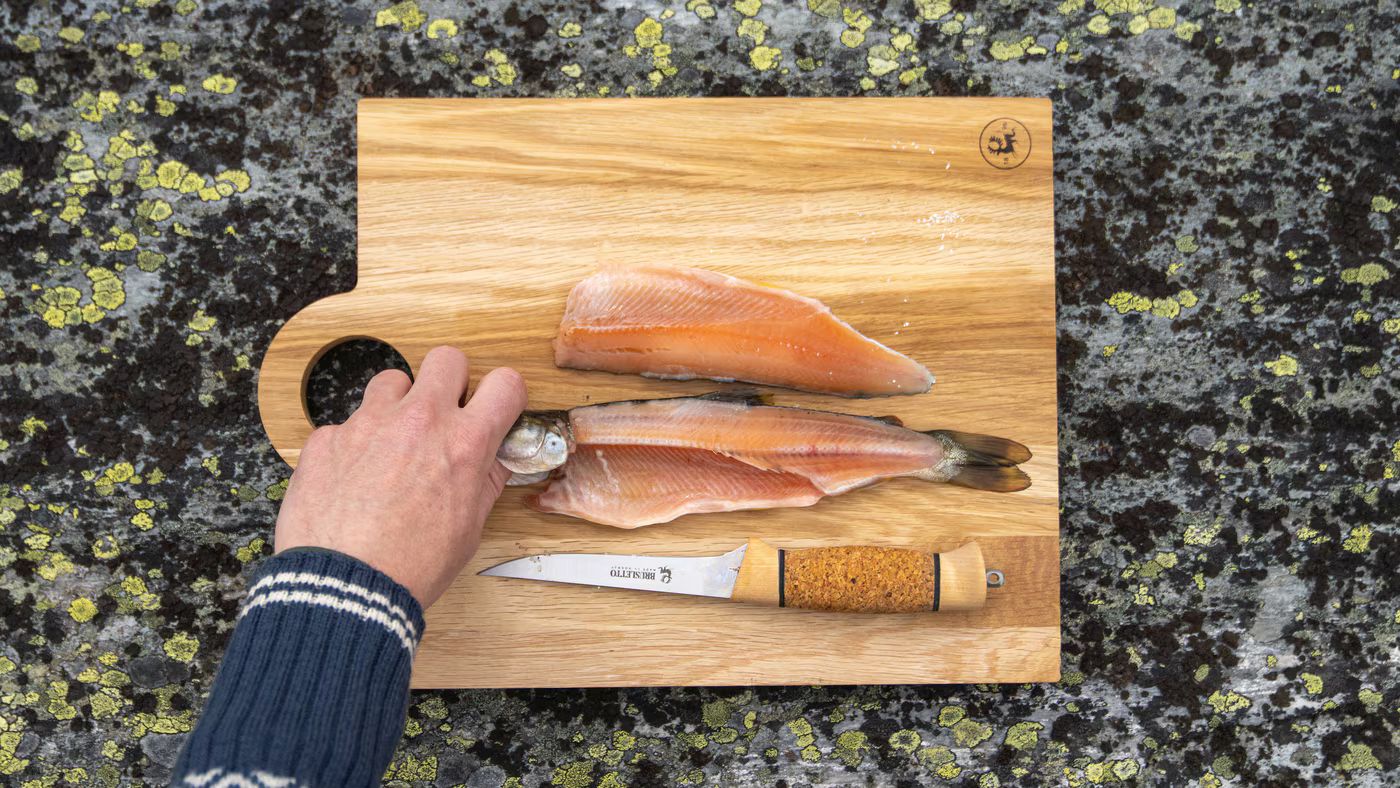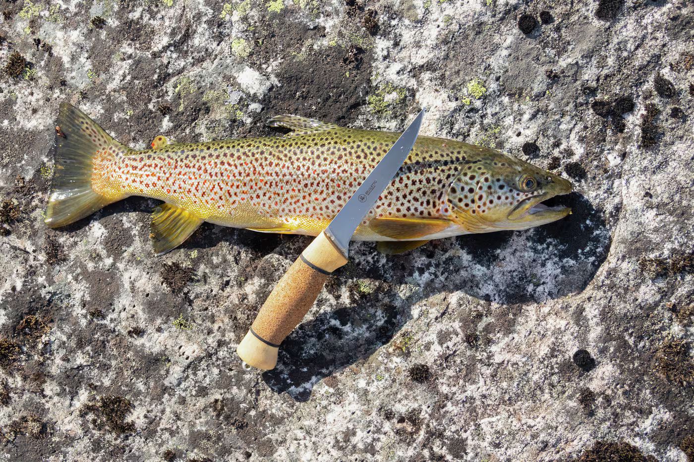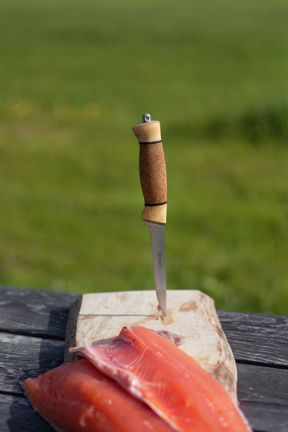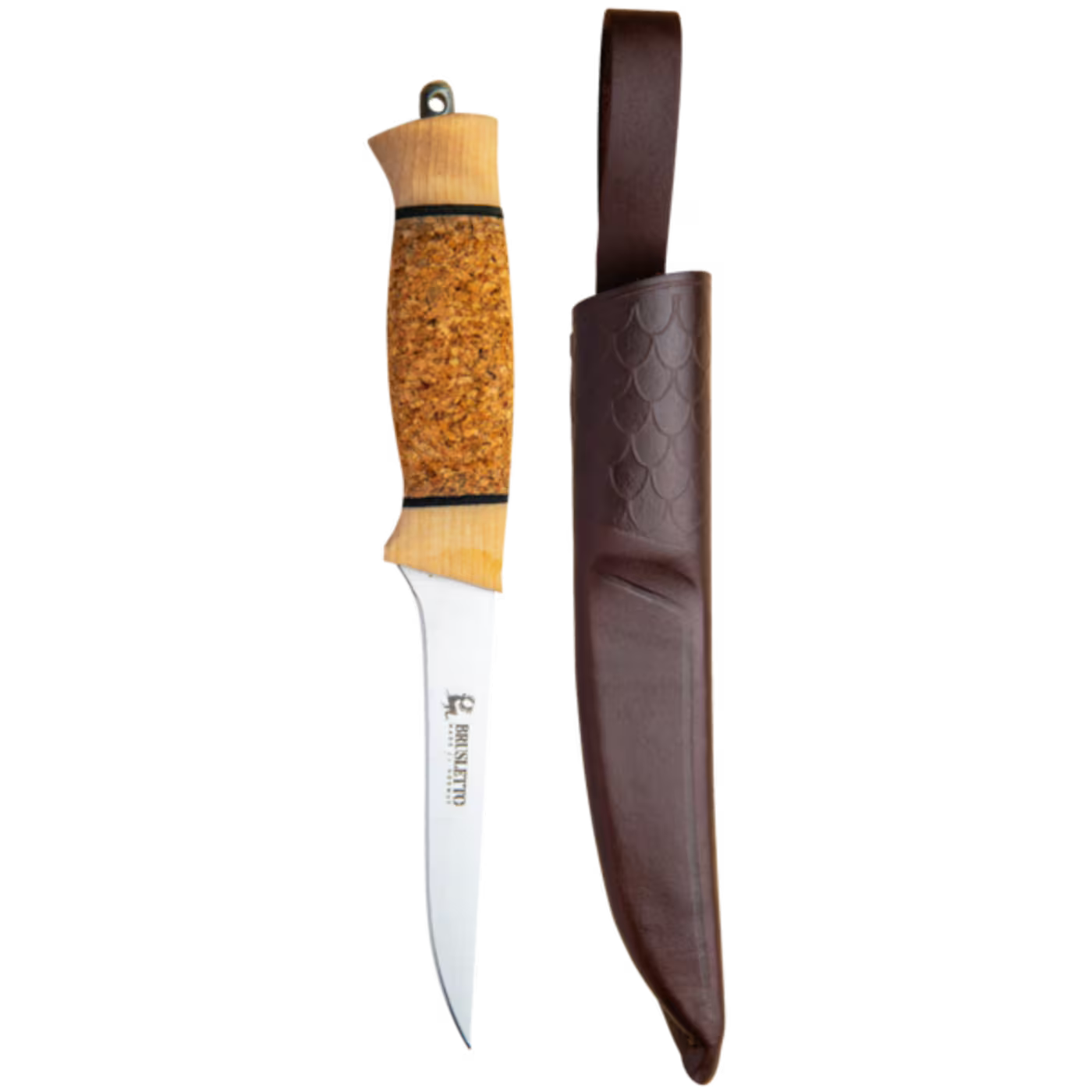 Dette er en perfekt fiskekniv med fleksibelt knivblad og kork i skaftet som holder kniven flytende hvis du er uheldig å mister den i vannet. Skaftet er fleksibelt og er laget av kork og norsk bjørk med gummi-innlegg mellom lagene noe som gir kniven et godt grep selv om den blir våt. Bladet er konslipt og tynt og gjør at kniven er god til å filetere fisk. Bakerst på skaftet er det et hull til å sette snor, hvis man ønsker dette. Sandvik stål i knivbladet som er ekstra holdbart og kork/ oljet bjørk i skaftet. Kniven leveres med lærslire og og en flott gave eske.