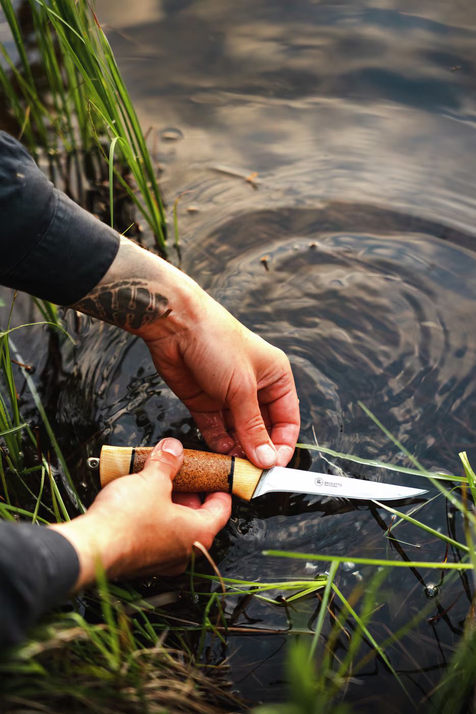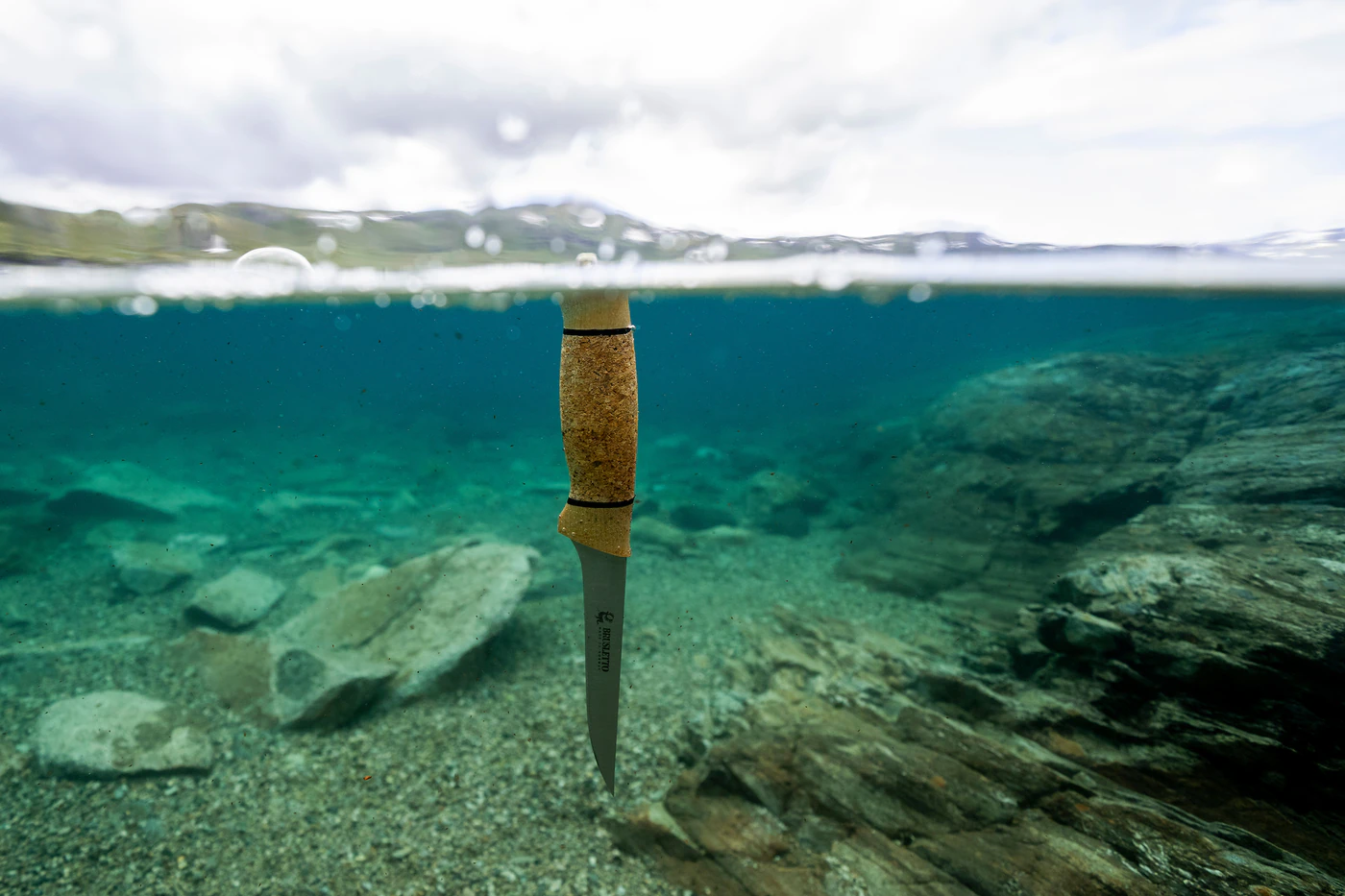 Fiskekniv med kork i skaftet som holder den flytende. Fleksibelt konisk knivblad, med kork/ oljet bjørk i skaftet. Sandvik stål i knivbladet