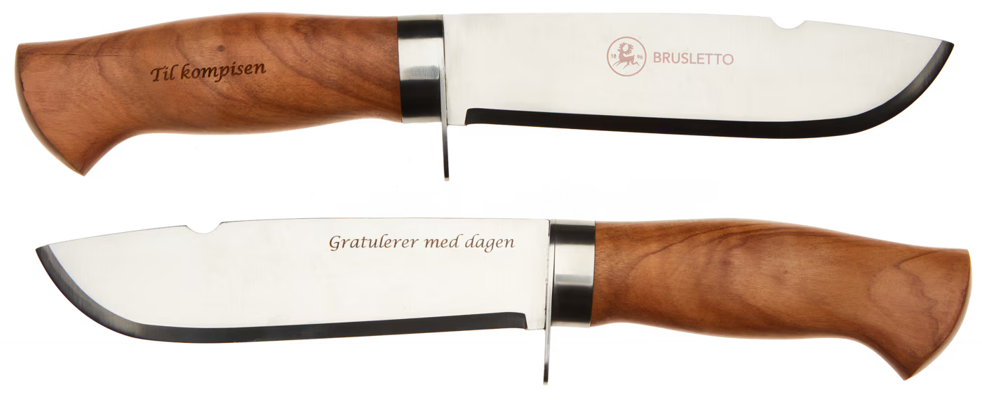 Vi har mulighet til å gravere på kniven. Legg ved en kommentar i bestillingen om hva du ønsker å få gravert!