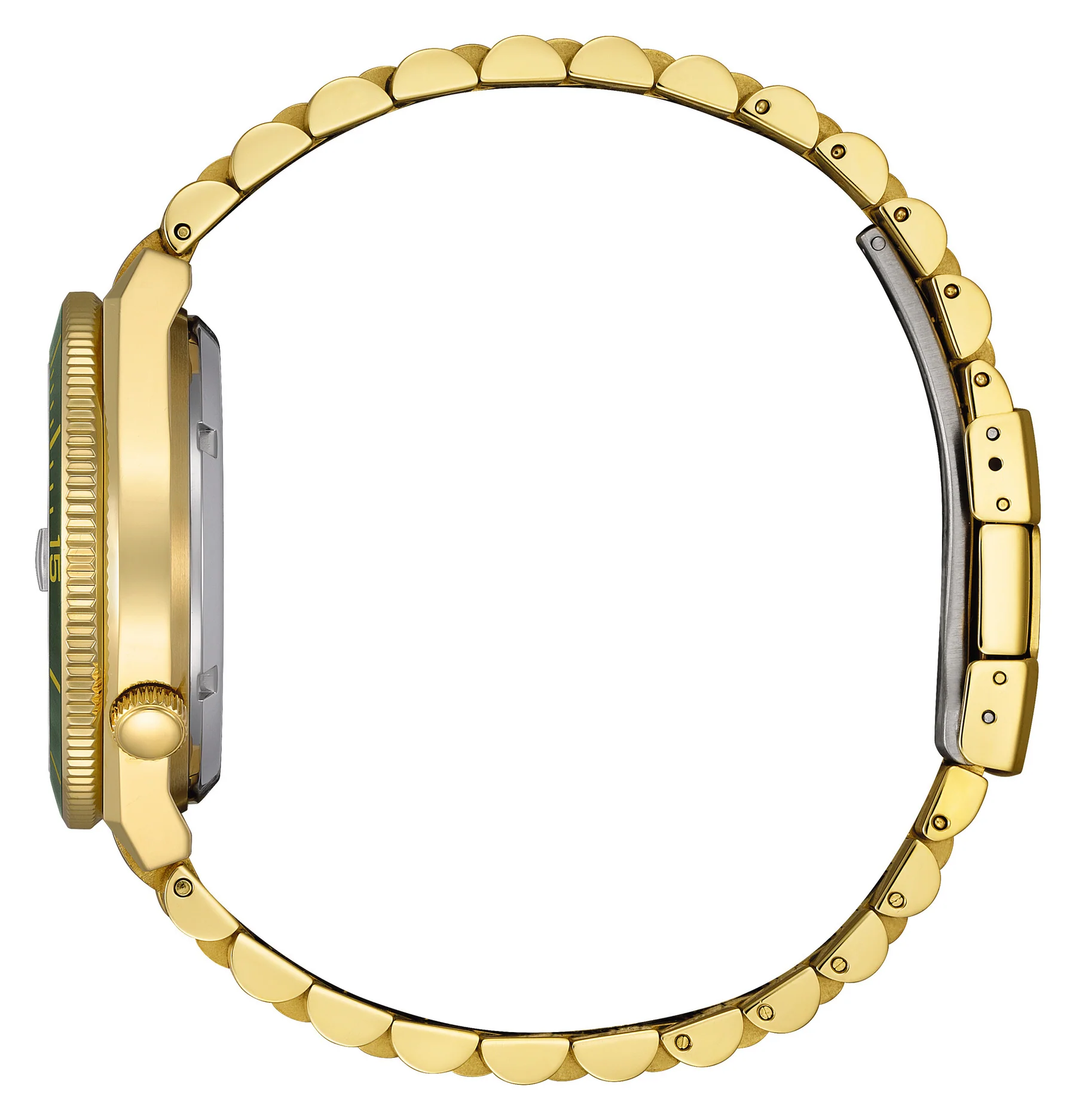 Citizen Tsuyosa NJ0232-53X er en stilfull og ettertraktet automatisk herreklokke i gullfarget rustfritt stål, som kombinerer sporty design med elegant finish. Klokken har en grønn urskive med indeksmarkeringer, en matchende grønn roterbar bezel og en solid lenke i gullfarget rustfritt stål, noe som gir modellen et karakteristisk uttrykk.
