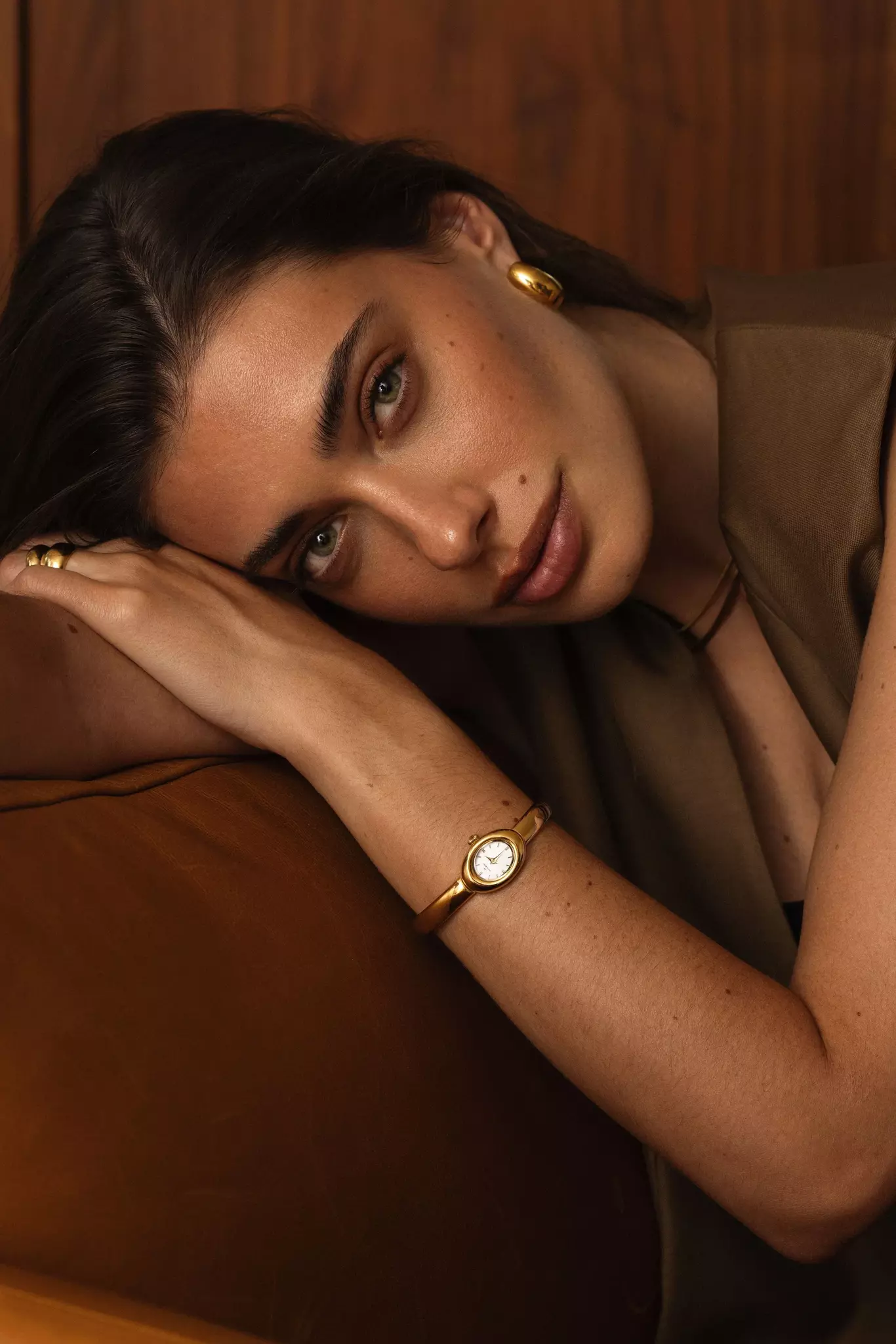 Belle Oval Petite Bangle Watch fra Mockberg er en kombinasjon av armbåndsur og smykke, utviklet for alle som ønsker et stilrent, men særpreget alternativ til tradisjonelle klokker. Modellen har en oval urskive med hvit bakgrunn og gullfargede indeksmarkeringer og visere, som gir god lesbarhet i et minimalistisk uttrykk.
